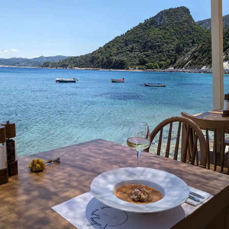 Asimopetra is a slightly fancy yet beautifully relaxed restaurant, located just a meter from the sea. On nights with a full moon, the view is magical as the moon reflects on the shimmering water.